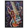 Encased in a sleek black frame, "Neon Serenade" comes alive as a vibrant 60cm x 90cm fusion of art forms. This eclectic piece blends the tactile appeal of hand-painting with the modern allure of LED illumination and the raw energy of print. At its heart, a graffiti-styled guitar in vivid pop colours takes center stage, its form accentuated by a luminescent LED strip that traces half its outline, casting a radiant glow and imbuing the artwork with a dynamic rhythm. This electric instrument is set against a spirited backdrop teeming with graffiti hearts and music note symbols, each one a testament to the universal language of love and music. As these elements converge, "Neon Serenade" emerges not just as a visual spectacle but as an ode to the rebellious spirit of rock 'n' roll and the passions that drive us.