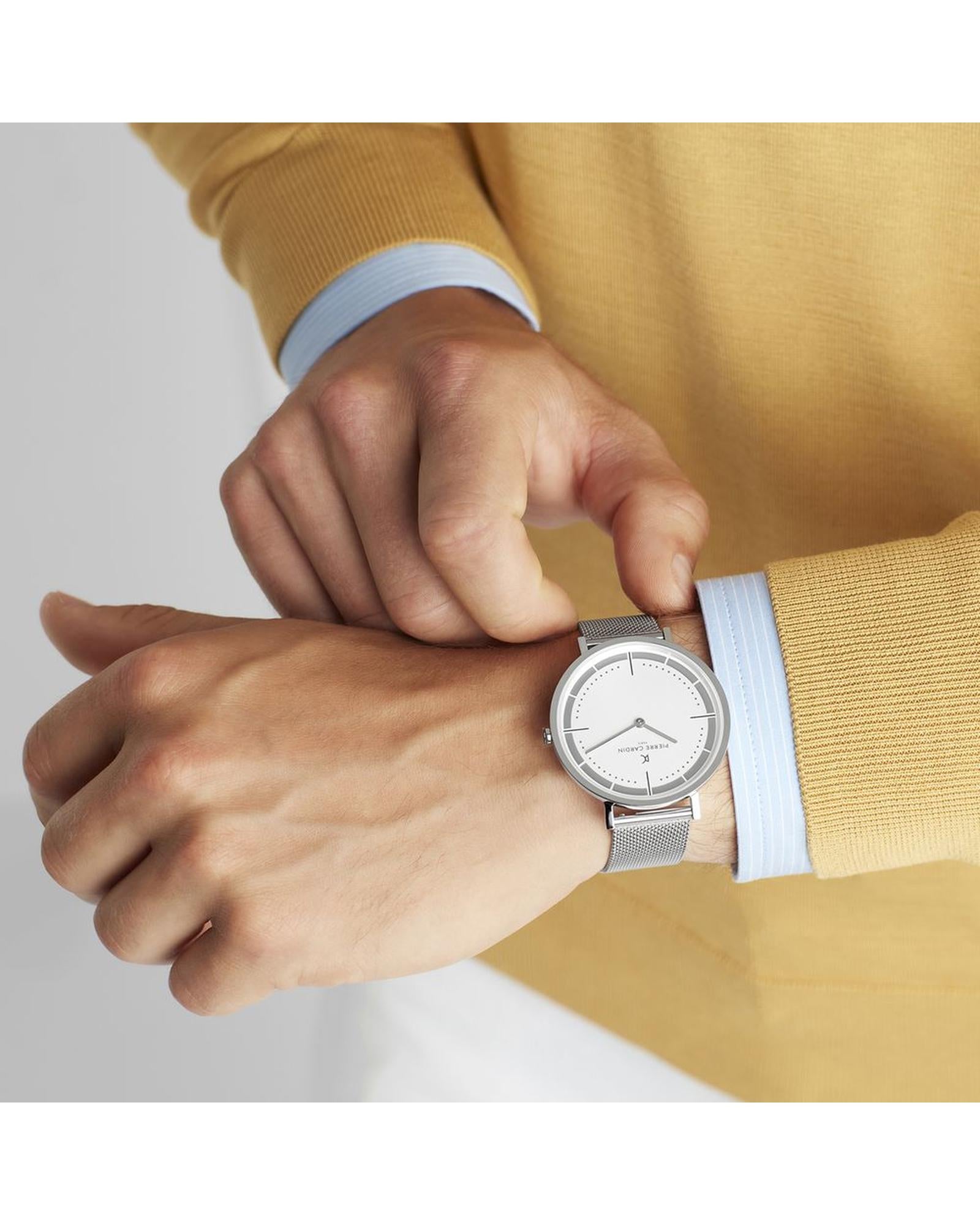 • Mens silver watch with a stainless steel case Quartz clockwork and analog display format Water resistance of 3 ATM Folding clasp for secure closure No extra functions Silver stainless steel wristband with a strap connecting width of 18mm Maximum wrist circumference of 19mm Includes a watch box for storage Mineral glass for durability Silver display color No automatic power reserve No bezel