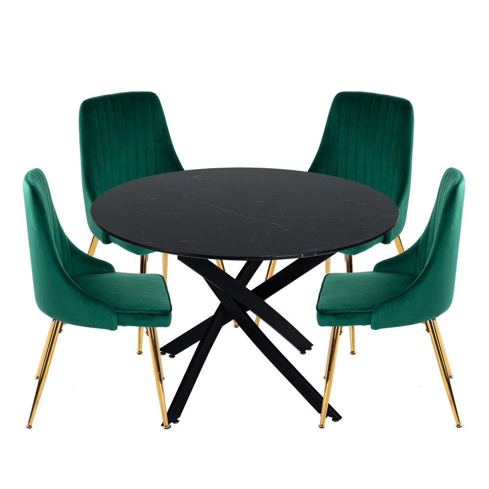 Look! What an attractive set of tables and chairs! This dining chair set includes a marble dining chair and four elegant retro velvet dining chairs, which are low-key and elegant.This table adopts a solid MDF desktop and elegant black marble design with white texture. It is simple and advanced, and can be easily integrated into the dining environment.The legs are made of powder coated steel and are sturdy and durable. The bottom also has a non slip design, which is to protect the floor under the table from scratches and increase stability. The legs of this table are staggered, which is very fashionable. It can add fashion elements to your home.